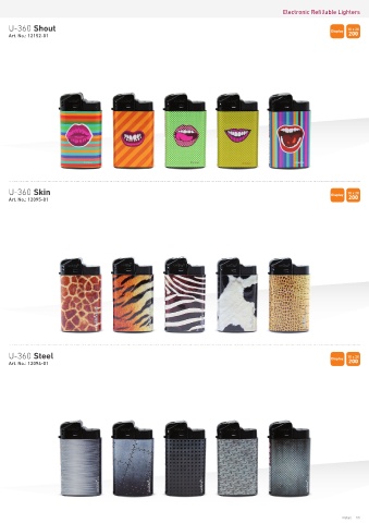 Electronic Refillable Lighters U-360 Shout Display Art. No.: 12152-01 U-360 Skin Display Art. No.: 12095-01 U-360 Steel Display Art. No.: 12094-01 Retail 11