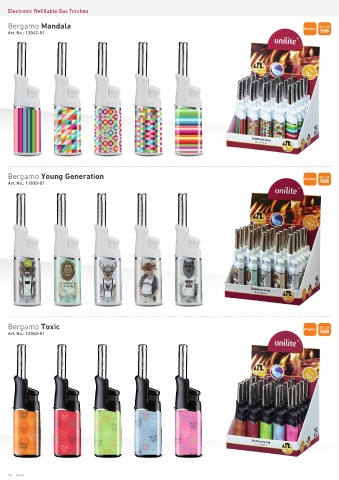 Electronic Refillable Gas Torches Bergamo Mandala Display Art. No.: 12042-01 Bergamo Young Generation Display Art. No.: 11830-01 Bergamo Toxic Display Art. No.: 12040-01 12 Retail