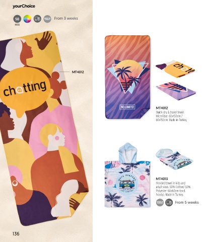 50 From 3 weeks MOQ MT4012 MT4012 Quick dry & travel towel. Microfiber. 60x150cm / 80x150cm. Made in Turkey. MT4013 Hooded towel in kids and adult sizes. 50% Cotton/ 50% Polyester 60x60cm (excl. hoody). Made in Turkey. From 5 weeks 136