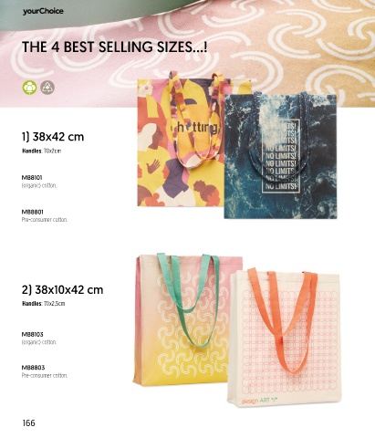 THE 4 BEST SELLING SIZES...! 1) 38x42 cm Handles: 70x2cm MB8101 (organic) cotton. MB8801 Pre-consumer cotton. 2) 38x10x42 cm Handles: 70x2,5cm MB8103 (organic) cotton. MB8803 Pre-consumer cotton. 166