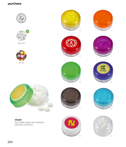 08 10 Dextrose mints 05 21 Choco mix 09 04 27 66 M12001 Round plastic container with coloured lid. Dimensions: ø 45x25 mm. 06 22 204