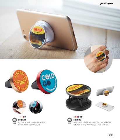 250 MPHN10 250 MPHN16 MOQ Magnetic air vent mount holder with 2D MOQ Two function, foldable ABS phone stand and holder with custom design (up to 4 colours). full colour doming. Own PMS colour from 2.500 pcs. 231