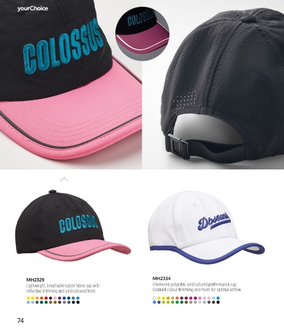 MH2329 MH2334 Lightweight, breathable taslon fabric cap with Checkered polyester, unstructured performance cap. reflective trimming and unstructured front. Contrast colour trimming and mesh for optimal airflow. 74