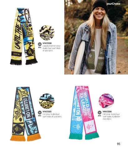 MW2008 100 MOQ Lowest priced full colour double layer scarf. Made of satin fabric. MW2005 MW2006 50 50 MOQ Full colour double layer MOQ Full colour double layer scarf made of polyester scarf made of Lycra fabric. mesh fabric. 95