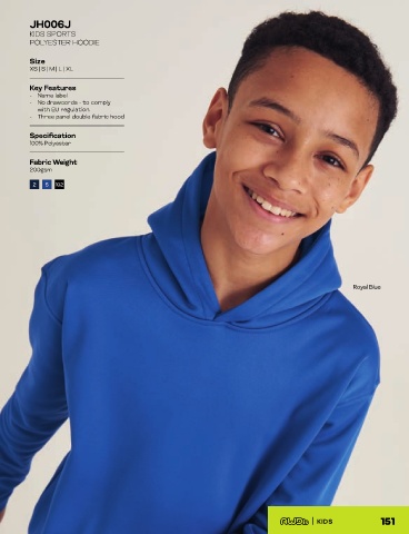 JH006J KIDS SPORTS POLYESTER HOODIE Size XS | S | M | L | XL Key Features - Name label - No drawcords - to comply with EU regulation - Three panel double fabric hood Specification 100% Polyester Fabric Weight 200gsm 2 5 102 Royal Blue KIDS 151