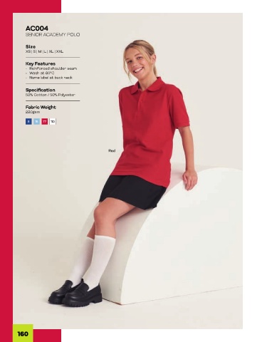 AC004 SENIOR ACADEMY POLO Size XS | S | M | L | XL | XXL Key Features - Reinforced shoulder seam - Wash at 60ºC - Name label at back neck Specification 50% Cotton / 50% Polyester Fabric Weight 220gsm 5 15 77 110 Red 160