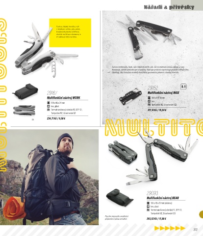 šroubovák, otvírák lahví a konzerv a karabina. Nástroje vyrobené v technologií přesného stříhání (fine-