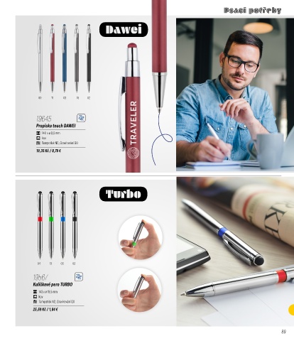 Psací potřeby Dawei 00 11 03 15 02 19645 Propiska touch DAWEI 140 x ø 8,5 mm kov Tampotisk N2, Gravírování G0 19,35 Kč / 0,78 € Turbo 04 13 03 02 19567 Kuličkové pero TURBO 143 x ø 10,5 mm kov Tampotisk N2, Gravírování G0 25,59 Kč / 1,04 € 89