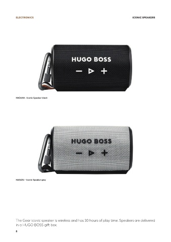ELECTRONICS ICONIC SPEAKERS HAE421A - Iconic Speaker black HAE421J - Iconic Speaker grey The Gear iconic speaker is wireless and has 30 hours of play time. Speakers are delivered in a HUGO BOSS gift box. 8