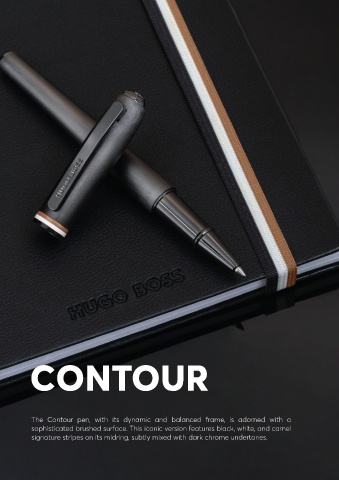 CONTOUR The Contour pen, with its dynamic and balanced frame, is adorned with a sophisticated brushed surface. This iconic version features black, white, and camel signature stripes on its midring, subtly mixed with dark chrome undertones.