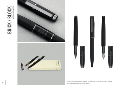 BRICK / BLOCK WRITING INSTRUMENTS 2. 4. 3. 1. The Brick pen line is made of brass. Ballpoints are outfitted with blue ink refills as standard. Rollerball 20 pens are outfitted with black ink refills as standard.