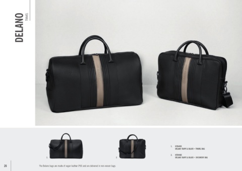 DELANO TRAVEL 1. NTB406X DELANO TAUPE & BLACK • TRAVEL BAG 2. NTD406X 1. 2. DELANO TAUPE & BLACK • DOCUMENT BAG 26 The Delano bags are made of vegan leather (PU) and are delivered in non-woven bags.
