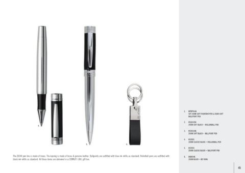 The ZOOM pen line is made of brass. The keyring is made of brass & genuine leather. Ballpoints are outfitted with blue ink refills as standard. Rollerball pens are outfitted with 6. NAK914A