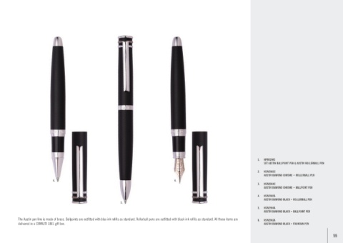 The Austin pen line is made of brass. Ballpoints are outfitted with blue ink refills as standard. Rollerball pens are outfitted with black ink refills as standard. All these items are 6. NSW2982A