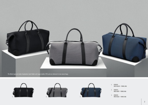 The Mesh bags are made of polyester mesh fabric and vegan leather (PU) and are delivered in non-woven bags. 1. NTB407A MESH BLACK • TRAVEL BAG 2. NTB407H MESH GREY • TRAVEL BAG 3. NTB407N 1. 2. 3. MESH BLUE • TRAVEL BAG 7