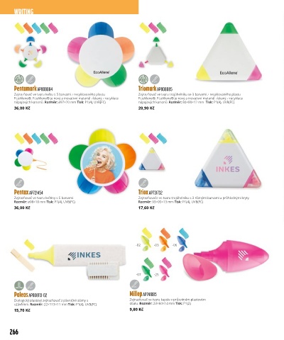 Zvýrazňovač ve tvaru květiny s 5 barvami. Zvýrazňovače ve tvaru trojúhelníku s 3 různými barvami a průhlednými kryty.
