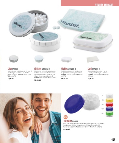 stisknutím víčka. Rozměr: ø45×15 mm plechovým víčkem. Obsahující cca. Rozměr: 62×50×17 mm Tisk: P2(4), Rozměr: 75×45×5 mm Tisk: P1(4),