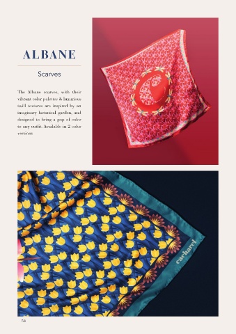 ALBANE Scarves The Albane scarves, with their vibrant color palettes & luxurious twill textures are inspired by an imaginary botanical garden, and designed to bring a pop of color to any outfit. Available in 2 color versions 54