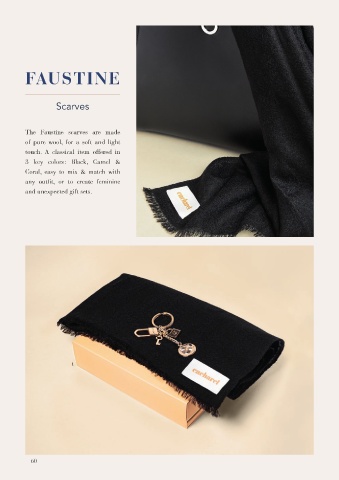 FAUSTINE Scarves The Faustine scarves are made of pure wool, for a soft and light touch. A classical item offered in 3 key colors : Black, Camel & Coral, easy to mix & match with any outfit, or to create feminine and unexpected gift sets. 1 60