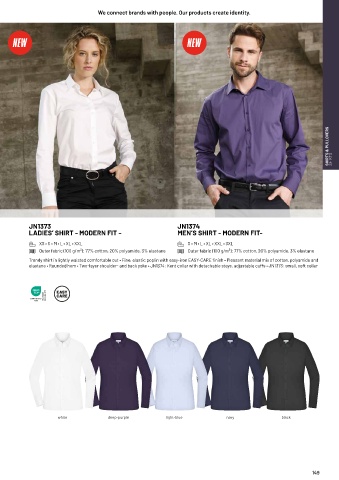 elastane • Rounded hem • Two-layer shoulder- and back yoke • JN1374: Kent collar with detachable stays, adjustable cuffs • JN1373: small, soft collar