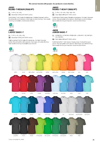 Round neckline with elastane • Neck tape, no side stitching • Twin needle cotton • Round neckline with elastane • Neck tape, no side stitching •