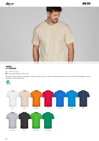 Comfortable T-shirt made of single jersey • Combed, ring-spun cotton • V-neck with elasthane • Necktape, no side stitching • Twin needle stitching on