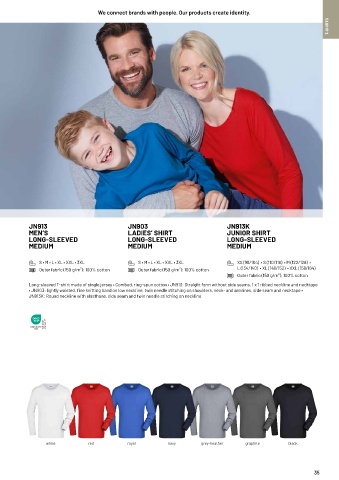 Long-sleeved T-shirt made of single jersey • Combed, ring-spun cotton • JN913: Straight form without side seams, 1 x 1 ribbed neckline and necktape