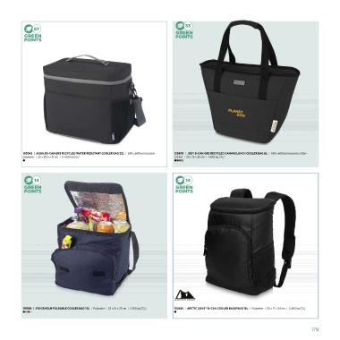119095 | STOCKHOLM FOLDABLE COOLER BAG 10L | Polyester | 23 x 19 x 25 cm | 1.550 kg CO e 120435 | ARCTIC ZONE® 18-CAN COOLER BACKPACK 16L | Polyester | 30 x 17 x 34 cm | 2.463 kg CO e