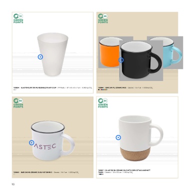 100854 | GLASTONBURY 300 ML REUSABLE PLASTIC CUP | PP Plastic | Ø 7 x 10 x 10 x 7 cm | 0.080 kg CO2 100844 | BARI 240 ML CERAMIC MUG | Ceramic | 8 x 7 cm | 1.030 kg CO2