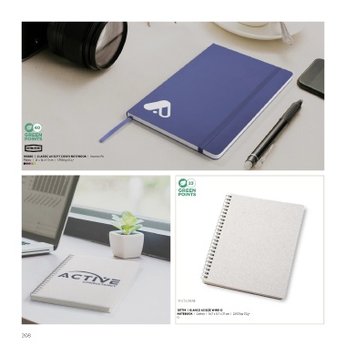 40 106830 | CLASSIC A5 SOFT COVER NOTEBOOK | Thermo PU Plastic | 21 x 14 x 1.3 cm | 1.358 kg CO 2 e 23 107719 | BIANCO A5 SIZE WIRE-O NOTEBOOK | Cotton | 14.7 x 0.7 x 21 cm | 2.193 kg CO 2 e 208