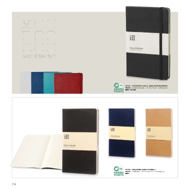 46 107151 | MOLESKINE CLASSIC L HARD COVER NOTEBOOK - RULED | Leatherette paper | 21 x 13 x 1.5 cm | 0.814 kg CO 2 e 46 107158 | MOLESKINE CAHIER JOURNAL L - RULED | Cardboard | 21 x 13 x 0.67 cm | 0.539 kg CO 2 e 214