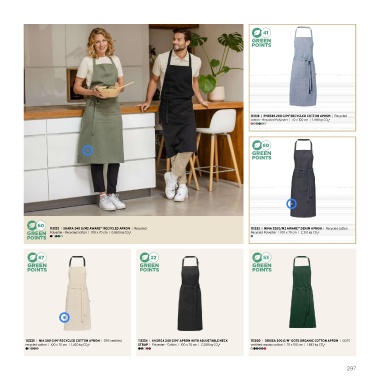 113325 | NIA 200 G/M² RECYCLED COTTON APRON | GRS certified 113334 | ANDREA 240 G/M² APRON WITH ADJUSTABLE NECK 113200 | ORISSA 200 G/M² GOTS ORGANIC COTTON APRON | GOTS