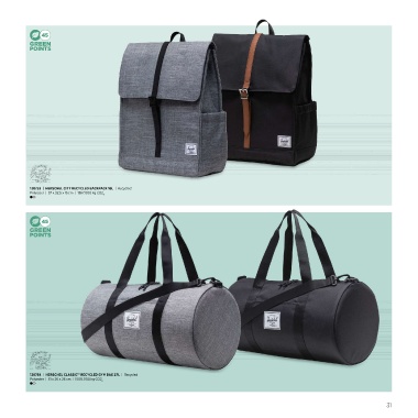 45 120753 | HERSCHEL CITY RECYCLED BACKPACK 16L | Recycled Polyester | 37 x 32.5 x 15 cm | 1367.000 kg CO2 e 45 120754 | HERSCHEL CLASSIC™ RECYCLED GYM BAG 27L | Recycled Polyester | 51 x 26 x 26 cm | 1508.000 kg CO2 e 31