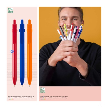 29 33 107964 | FIDGET RECYCLED PLASTIC BALLPOINT PEN (BLACK 107965 | X107966 | UNICA RECYCLED PLASTIC BALLPOINT PEN INK) | Recycled ABS Plastic | Ø 1.5 x 14.5 cm | 0.020 kg CO2 (BLUE INK) | Recycled ABS Plastic | Ø 1 x 13.8 cm | 0.020 kg CO2 e e 33