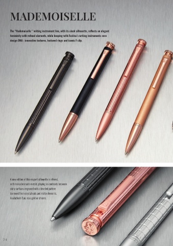 The “Mademoiselle ‘’ writing instrument line, with its sleek silhouette, reflects an elegant