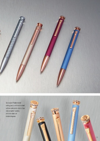 Our original “Mademoiselle” writing pieces, with their brushed surfaces and crystal adorned tops remain market favorites, with their sleek and detailed elegance. 25