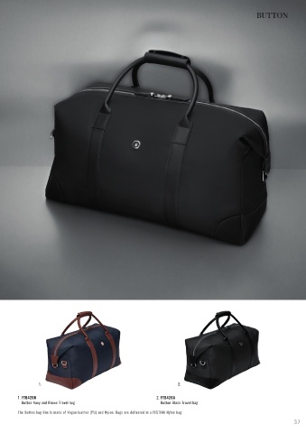 BUTTON 1. 2. 1. FTB426N 2. FTB426A Button Navy and Brown Travel bag Button Black Travel bag The Button bag line is made of Vegan leather (PU) and Nylon. Bags are delivered in a FESTINA Nylon bag. 37