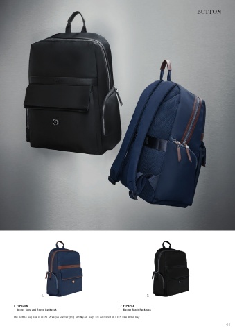 BUTTON 1. 2. 1. FTP426N 2. FTP426A Button Navy and Brown Backpack Button Black Backpack The Button bag line is made of Vegan leather (PU) and Nylon. Bags are delivered in a FESTINA Nylon bag 41