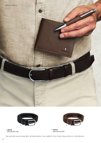 A CCESSORIES 1. 2. 1. FAB325A 2. FAB325Y Sports belt black Belt Sports belt brown Belt These sports belts are made of woven fabric, split leather and alloy. They are available in 2 sizes ( M and L). They are delivered in a Festina Nylon bag. 72