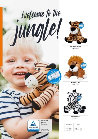 Welcome to the jungle! M160032 David Tiger | tiger M160033 Ole Löwe | lion M160037 Zora Zebra | zebra Preis Basis Größe base price size 1–99 ca. 1–9 9 Stück / pieces 18 cm 37