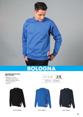 BOLOGNA SWEATER MADE IN ITALY 100% COTTON - Ribbed round neck S - M - L - XL - XXL - Triangular flag on side Made in Italy - Ribbed cuffs and band at the waist 6.5 cm h 25 pcs 280 g/m² - Stitching BLACK 988253 ROYAL 988252 NAVY 988250 415