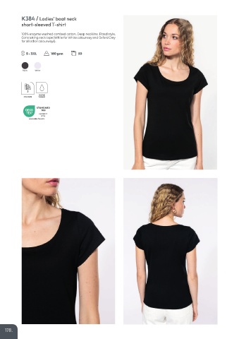 K384 / Ladies’ boat neck short-sleeved T-shirt 100% enzyme-washed combed cotton. Deep neckline. Fitted style. Contrasting neck tape (White for White colourway and Oxford Grey for all other colourways). S - 3XL 180 gsm 50 Black White 2 178.
