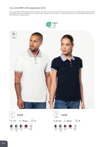 Contrasting neck tape. Contrasting inner placket with 3 buttons (men's version) or 4 buttons (ladies' version). Twin needle finishing at the