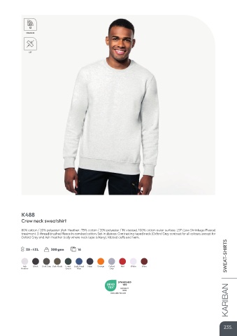 treatment. 3-thread brushed fleece in combed cotton. Set-in sleeves. Contrasting taped neck (Oxford Grey contrast for all colours, except for