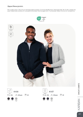 80% combed cotton / 20% LSF (Low Shrinkage Fleece) polyester. Pre-shrunk brushed fleece. Siliconised wash. Slim fit with a ribbed side