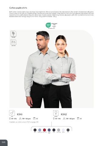 100% cotton. Cotton poplin. Easy care (Easy Care treatment). Tone on tone buttons. Rounded bottom. Men version: whaleboned collar point.