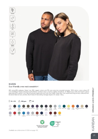 85% cotton/15% polyester. Made from 85% organic cotton and 15% post-consumer recycled polyester. 100% cotton outer surface.LSF