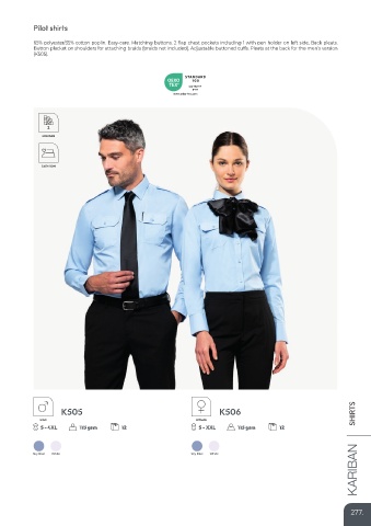 65% polyester/35% cotton poplin. Easy-care. Matching buttons. 2 flap chest pockets including 1 with pen holder on left side. Back pleats.