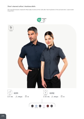 97% cotton/3% elastane. Elastane for fitted style and extra comfort. Soft collar. Matching buttons. Front and back darts. 1 spare button.