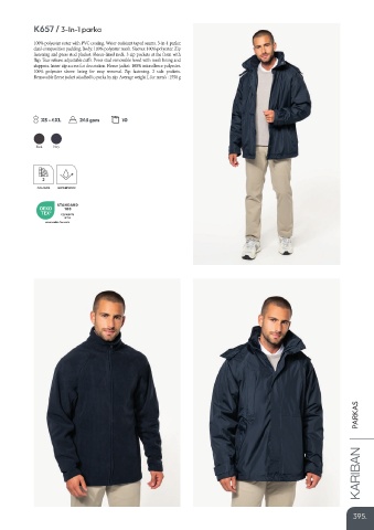 100% polyester outer with PVC coating. Water-resistant taped seams. 3-in-1 parka: